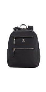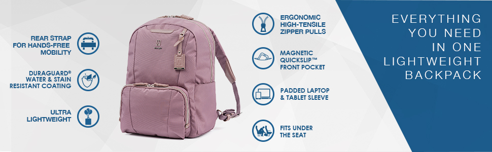 The Maxlite 5 women's backpack from Travelpro is designed specifically for the modern woman in a slimmer profile than our laptop backpack. Convenient features built-in to this lightweight, ultra-durable backpack include a padded laptop or tablet sleeve, organizational pockets for power cords, back-up batteries, office supplies and more, a quick-access front pocket with magnetic closure ideal for cell phone or key storage and an exterior side pocket that fits a water bottle or compact umbrella with ease. Wear this bag with comfort using the padded shoulder straps or use the unobtrusive rear strap to Stack this bag on top of a spinner or Rollaboard suitcase for hands-free mobility.
